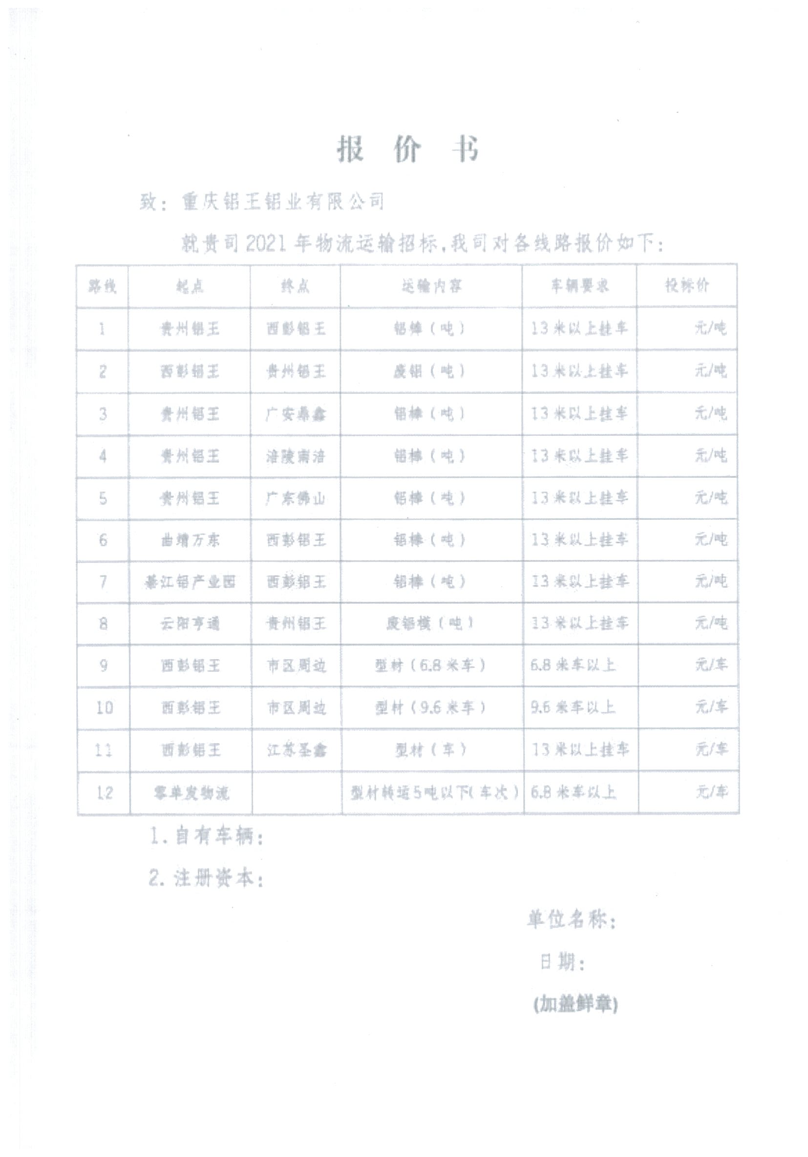 重庆铝王铝业有限公司成立于1993年,注册资本1.17亿元,资产总额4.3亿元,隶属于重庆市供销合作总社,座落于享有“中国铝都”美誉的重庆市西彭镇,占地面积74亩,建筑面积4万多平米。公司主营业务为工业、建筑铝型材生产加工、铝合金圆铸锭生产、建筑模板生产租赁。年生产铝合金型材18000吨,年需求铸棒20000余吨。为提高物流质量,现决定于近期就2021年公路干线运输进行公开、全面招标采购。招标有关事宜予以公告,竭诚欢迎符合要求的各类物流供应商参加投标。