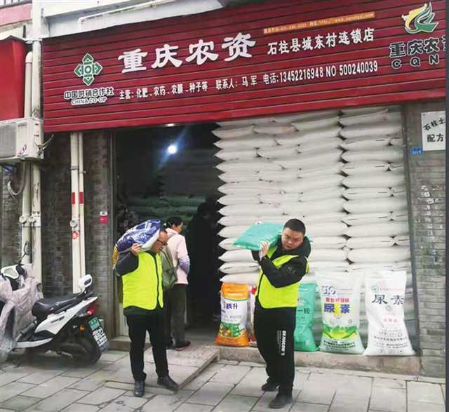 在重庆农资连锁石柱城东村连锁店,化肥、农药、种子等农资备货充裕、摆放整齐,工作人员正有序搬运,准备发往各个网点。