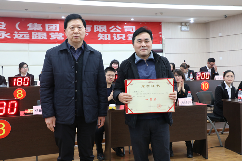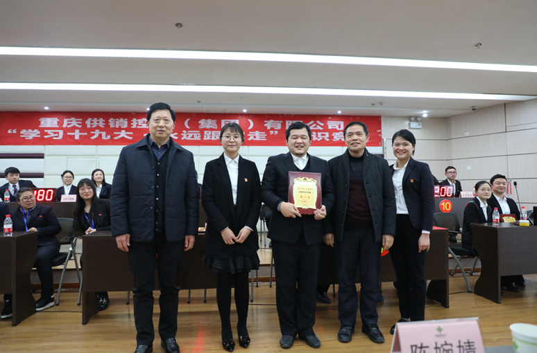 比赛现场精彩纷呈,高潮迭起,试题内容涵盖十九大精神、新党章以及供销社综合改革等相关内容。本次竞赛设置了必答题、选答题、抢答题及风险题等环节。各代表队参赛选手使出浑身解数,沉着应对,密切配合,气氛活跃而紧张,展现了丰富的知识积累和敏捷的思辨能力,上演了一场精彩纷呈的十九大精神文化盛宴。经过激烈角逐,农产品集团夺得了竞赛第一名的桂冠,农资集团、烟爆集团分获第二、三名。最后,市社和集团领导分别为本次竞赛获奖单位以及十九大征文比赛优胜选手颁发了奖状,并合影留念。