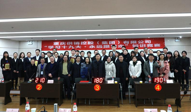 为进一步将党的十九大精神学习贯彻工作引向深入,激发全供销系统党员干部群众学习十九大精神的热情,切实把广大党员干部群众的思想认识和行动统一到党的十九大精神上来,供销集团党委于1月26日下午举办了“学习十九大·永远跟党走”专题知识竞赛活动。参加本次活动的有供销集团本部及下属9家子公司的参赛选手、集团本部全体干部职工及部分子公司领导。市总社组织人事处陈婉婧副处长、机关党委潘永琼同志亲临现场指导。